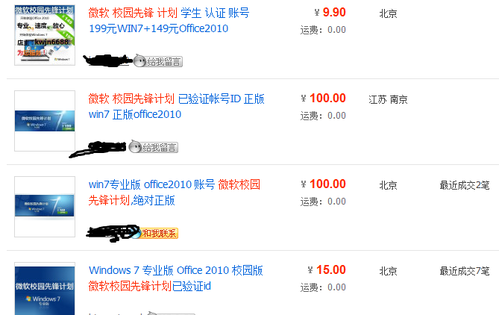 學生認證帳號的價格各種各樣,從10元左右到100元左右都有。而也有賣家出售已經購買后的正版Windows 7和Office 2010,這些商品的價格都比優惠價多了100元左右。