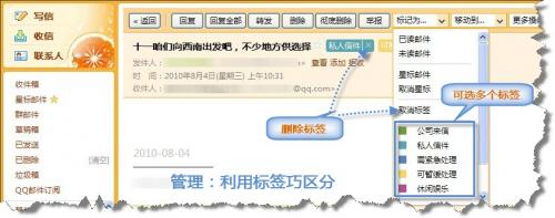 想象一下,在來(lái)信眾多的情況下,掃一眼,馬上知道有沒(méi)有紅色標(biāo)簽的“Boss郵件”,或者綠色標(biāo)簽的“休閑娛樂(lè)”,是件多爽快的事。值得一提的是,QQ郵箱還支持一封郵件多個(gè)標(biāo)簽哦,除了按發(fā)信人設(shè)置標(biāo)簽,也可以按照郵件的緊急程度、自己的處理習(xí)慣多設(shè)置幾個(gè)標(biāo)簽,一目了然你的郵箱。(圖2)